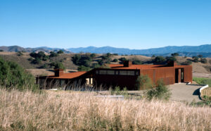 Contemporary Patrons visits a 100-foot-square home by Frederick Fisher & Partners, Architects, in Santa Ynez. Clad entirely in corrugated Cor-ten steel, the home is organized around a central courtyard with outdoor rooms to take advantage of the climate. Sliding glass panels blur the line between inside and outside and offer views of the serene landscape.