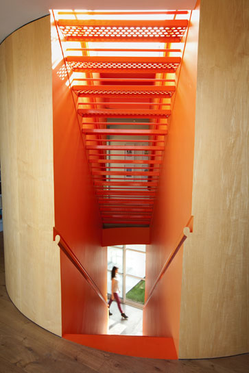 Throughout the interior and exterior spaces, the designer calls attention to the systems that support and define daily life, such as city grids, light cycles, and air circulation. The open indoor/outdoor floor plan radiates around a central cylindrical structure—sporting a bright-orange interior—that acts as the “guts” of the house, neatly concealing utilities. Surface tones of white and natural wood are accented with vibrant shades of blue, green, yellow, and orange in furnishings, fabrics, accessories, and art to warm the strong contemporary lines.
