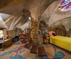 Hubbell’s vision is the antithesis of rational and industrial. “Most important is my infatuation with nature,” he says. “There is also my love of the primitive and naive, gothic architecture, the arts and craft movement, Frank Lloyd Wright, Gaudi, and the pleasure of working with the material of stone, wood, cement, clay, metal, glass, and mosaics.”