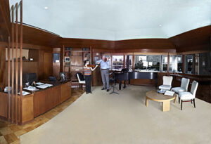 Designed by Frank Lloyd Wright, Jr. (son of the groundbreaking architect Frank Lloyd Wright) to meet Heifetz’ acoustic specifications, the small, hexagonal studio once was connected to Heifetz’ sprawling estate by a covered breezeway. Heifetz (1901-1987) was a violinist whose name for more than half a century was synonymous with perfection of technique and musicianship. Heifetz also played the piano. Today the studio serves as the site of master classes and inspiration for young students.