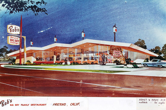 Celebrated expert on Googie architecture, historian and writer Hess explains the first Googies, a Sunset Boulevard coffee shop designed by John Lautner, FAIA (1911-1994) , and relates how Armet & Davis took over the reins, remodeling Lautner’s design in 1955, and turning it into a model for every major coffee shop/diner that emerged in succeeding decades. In its earliest days, the shocking architecture was ridiculed by critics as “kitsch” and “unrealistic,” and worse—”too commercial.” The attacks by critics (read: architecture snobs) fell on the deaf ears of restaurateurs and the public, who were literally eating up the accessibility, the fun, and the futurism.
